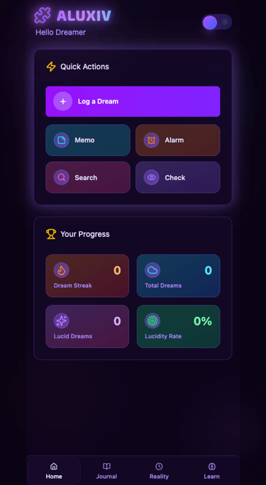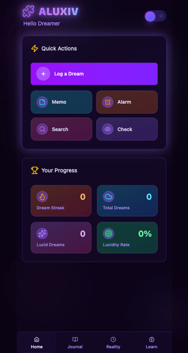 The Aluxiv app helps you take control of your dreams with the right tools: log and track your dreams, receive instant interpretations, review detailed statistics, set reality checks, and learn lucid dreaming techniques through mini courses.